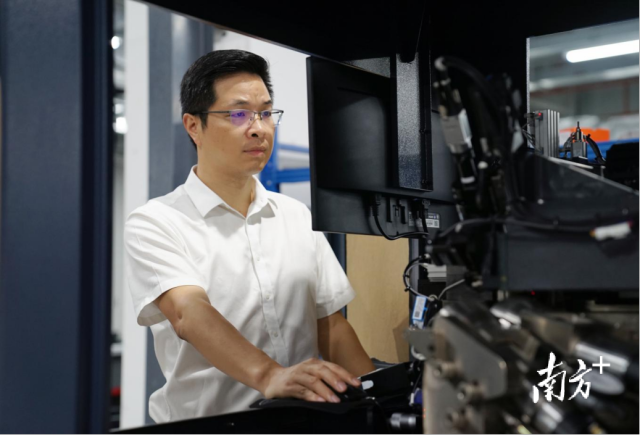 赖正友正在检查数控排钻钻盒的精度。图源南兴装备股份有限公司