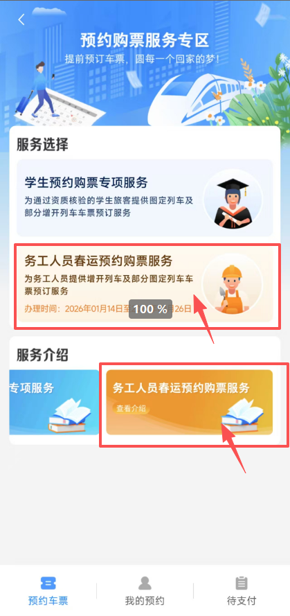 ②点击下方“务工人员春运预约购票服务”可详细了解要求和流程。点击上方“务工人员春运预约购票服务”可进行购票。