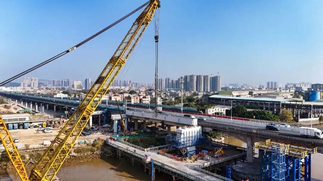 △麻涌互通立交桥中缝完成首片箱梁架设。图源:广东省公路建设有限公司