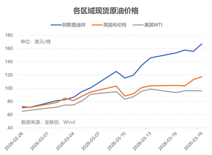 由于冲突导致霍尔木兹海峡运输停摆、贸易量锐减,中东原油基准价格升至历史新高,成为全球最贵的原油。3月19日,迪拜原油现货价格已达166.97美元/桶,相比布伦特原油的溢价已接近50美元/桶。