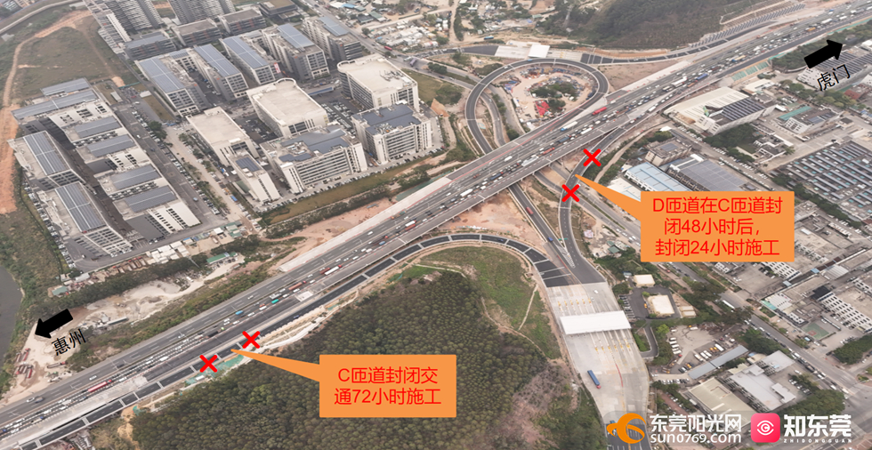 关于对莞樟路收费站(G1523)C、D匝道 进行临时封闭施工交通管制的公告 为保障甬莞-莞佛高速公路常平至虎门段及虎门港支线改扩建项目顺利推进,根据本项目最新改扩建施工计划,G1523甬莞高速莞樟路收费站C(甬莞高速西行主线转莞樟路收费站出口匝道)、D匝道(甬莞高速莞樟路收费站转常虎西行主线匝道)因摊铺拼宽路面及施划永久标线,于2026年4月8日8时开始交通管制至2026年4月11日8时开通,交通管制时长72小时。请广大司乘人员密切关注交通动态,合理安排出行计划和选择出行路线。因施工给您带来的出行不便,敬请谅解。现就具体管制情况公告如下: 一、管制时间 2026年4月8日8时至2026年4月11日8时,共计3天,管控地点时间如下: 1. 封闭甬莞高速西行主线转莞樟路收费站出口匝道:自4月8日起,全程封闭72小时; 2. 封闭莞樟路收费站转甬莞高速西行主线匝道:自4月8日起对甬莞高速西行主线转莞樟路收费站出口匝道封闭满48小时后,4月10日8时对莞樟路收费站转甬莞高速西行主线匝道进行封闭,封闭时长24小时; 3. 解封时间:甬莞高速西行主线转莞樟路收费站出口匝道封闭满72小时后,甬莞高速西行主线转莞樟路收费站出口匝道与莞樟路收费站转甬莞高速西行主线匝道将一起解封,恢复正常通行。具体开通时间以最新公告为准。 二、管制路段 封闭莞樟路收费站2个分合流匝道口,甬莞高速保持主线通行。具体封闭口如下: (一)甬莞高速西行主线转莞樟路收费站出口匝道。(72小时) (二)莞樟路收费站转甬莞高速西行主线匝道。(24小时) ▲封闭示意图 三、高速绕行路线 封闭甬莞高速西行主线转莞樟路收费站出口匝道,建议G1523甬莞高速、G94珠海三角环线高速车流可从周围临近常平收费站、大朗收费站、黄江收费站、松山湖收费站下高速。 封闭莞樟路收费站转甬莞高速西行主线匝道。建议G1523甬莞高速、G94珠海三角环线高速车流可从周围临近常平收费站、大朗收费站、黄江收费站、松山湖收费站上高速。 四、地方绕行路线 1.常平收费站分流路径 甬莞高速西行方向车流可从常平收费站进出站。具体绕行路线:常平收费站→常平新城大道→环常南路前往大朗方向→常黄路前往黄江方向。 2.松山湖收费站分流路径 常虎高速东行方向车流可从松山湖收费站进出站。具体绕行路线:松山湖收费站→阿里山路→迎宾路或X241前往大朗方向→富民中路前往石厦方向→金朗路前往黄江方向 3.大朗收费站分流路径 珠三角环线高速车流可从大朗收费站进出站。具体绕行路线:大朗收费站→迎宾路或X241前往大朗方向→富民中路前往石厦方向→金朗南路前往黄江方向 4.黄江收费站分流路径 珠三角环线高速车流可从黄江收费站进出站。具体绕行路线:黄江收费站→S529公常路前往黄江方向→富民中路前往大朗→莞樟路前往黄江方向 五、特别提示 如出现特殊情况导致交通管制时间变化,具体交通管制通告将视情况另行发布。请过境车辆及时关注导航信息及高速公路情报信息板提示,因施工给您带来的出行不便,敬请谅解。 特此通告。 东莞市路桥投资建设有限公司 2026年3月31日