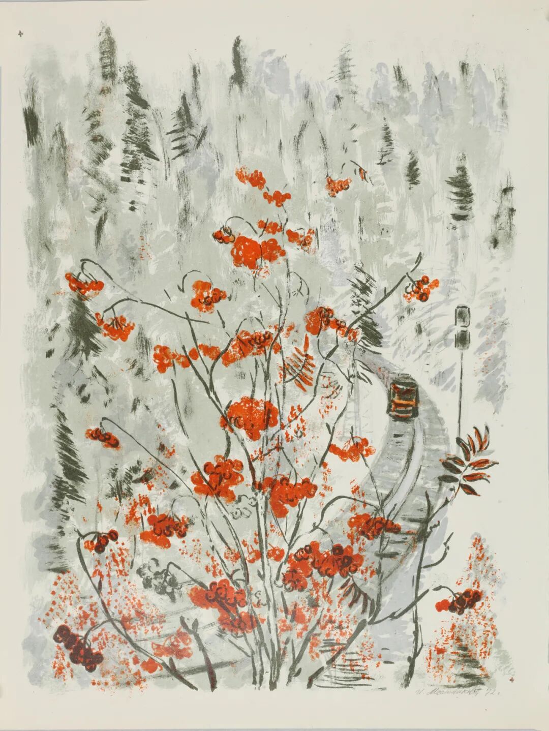 走进玛斯列妮柯娃的石版画世界,仿佛推开了伏尔加河畔一扇安静的窗。窗台上,一束野罂粟花在晨光中轻轻摇曳;窗户外,乌拉尔的花楸树正结出鲜红的果穗。这位来自列宁格勒的女画家,用细腻的笔触为我们捕捉了太多这样的瞬间——瓶中的黄菊、窗前的麻雀、农庄的炊烟、春日的斜阳。在她的笔下,寻常花卉有了静默的生命力,平凡日常凝固成永恒的诗意。