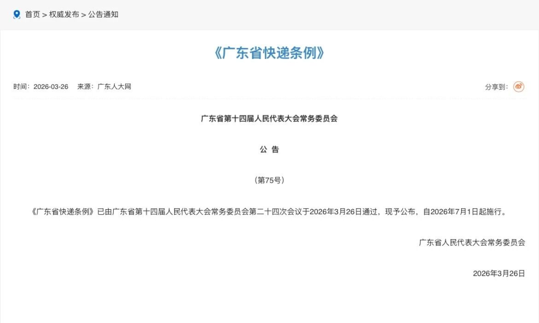 近日,广东省十四届人大常委会第二十四次会议通过《广东省快递条例》(以下简称“条例”),条例自7月1日起施行。