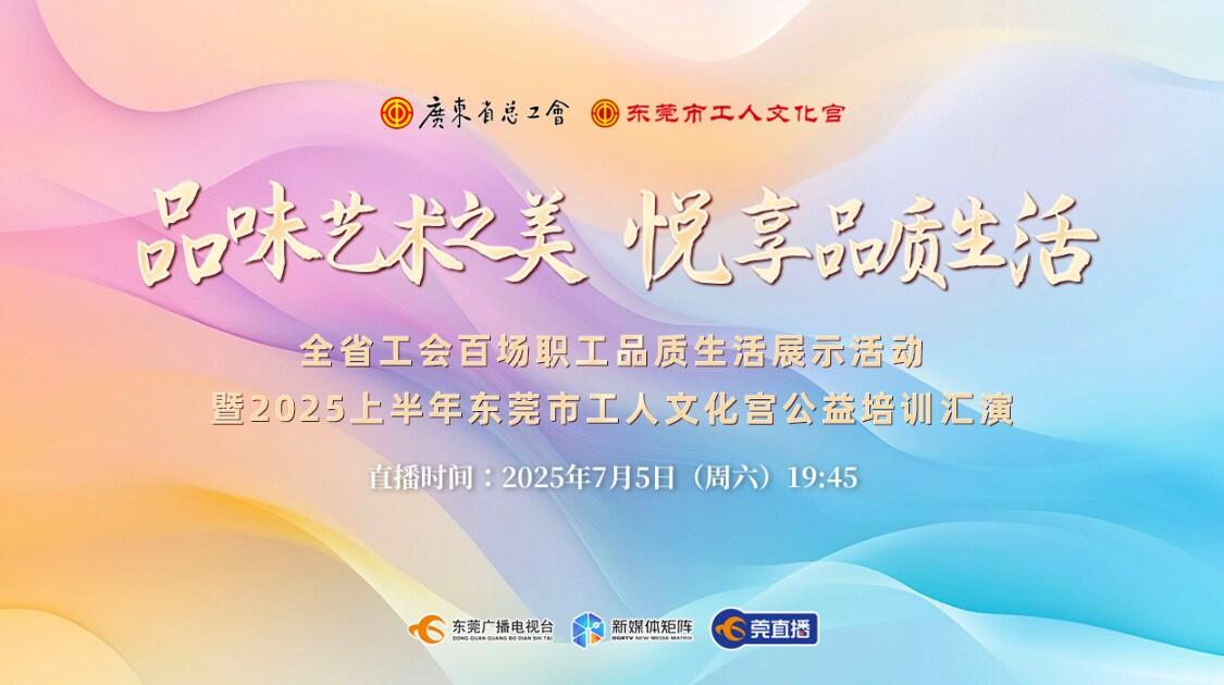 7月5日19:45,“品味艺术之美 悦享品质生活”全省工会百场职工品质生活展示活动暨2025上半年东莞市工人文化宫公益培训汇演将在知东莞APP全程直播,敬请期待!